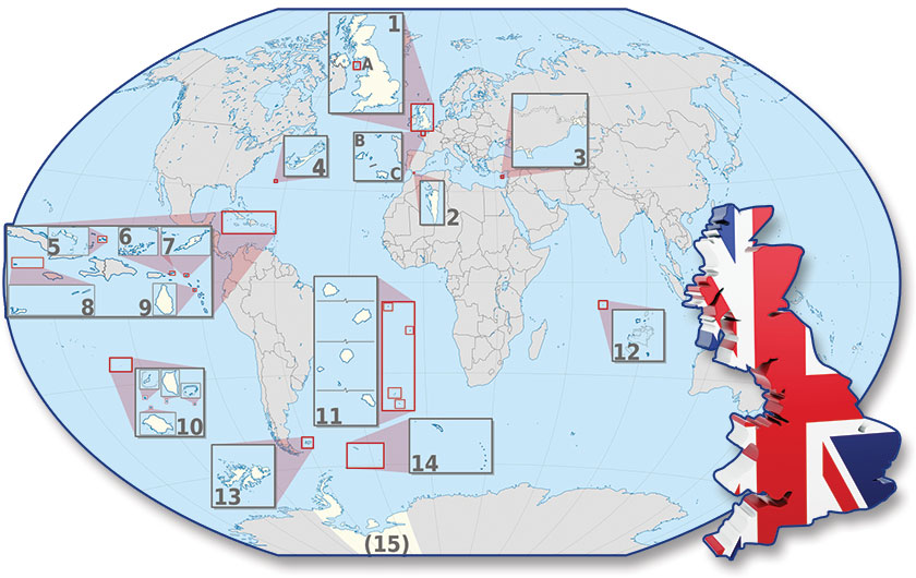 1A. MAN ADASI1B. MANŞ ADALARI1C. JERSEY ADASI 2. CEBELİTARIK3. GÜNEY KIBRIS | 4. BERMUDA5. TURKS VE CAICOS ADALARI6. BRİTANYA VİRJİN ADALARI7. ANGUILLA ADASI8. CAYMAN ADALARI9. SAINT KITTS VE NEVIS ADALARI | 10. PITCAIRN ADALARI11. ST HELENA12. BRİTANYA HİNT OKYANUSU TOPRAKLARI13. FALKLAND ADALARI14. GÜNEY GEORGIA15. BRİTANYA ANTARKTİKA TOPRAKLARI |