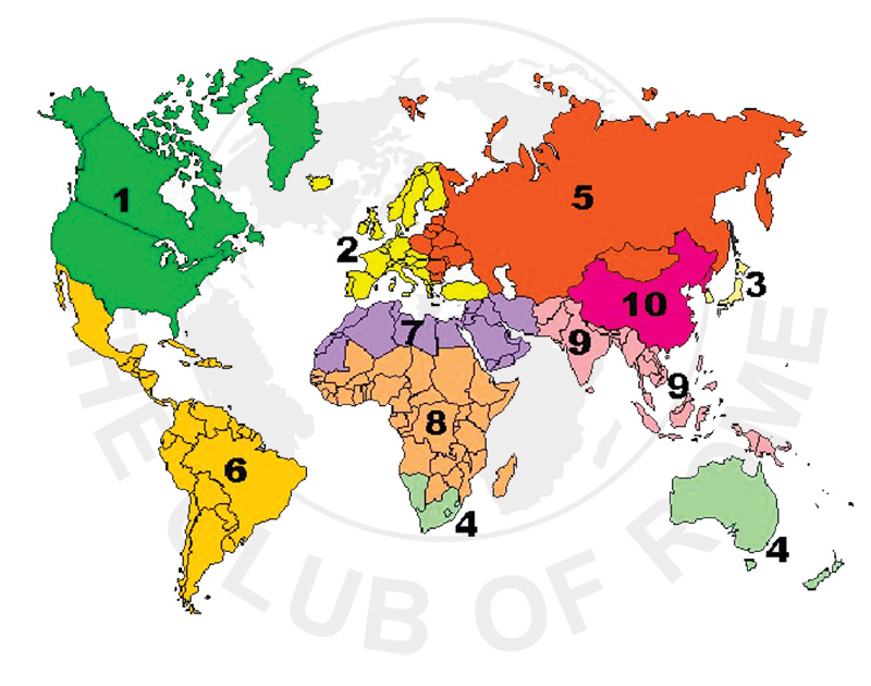 1973 yılında Roma Kulübü tarafından yayınlanan üstteki haritada, dünyanın ekonomik/politik bölgeleri 10'a ayrılmış ve bunların her biri "Krallık" olarak adlandırılmıştı. Bu harita, bütün dünyanın tek bir liderlik altında birleşmesini sembolize ediyordu. Dünyaya hükmeden liderlik ise İngiltere Krallığı olacaktı. |