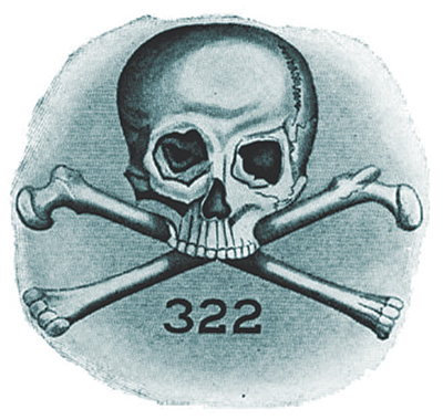 Skull and Bones amblemi, kafatası ve çapraz kemiklerden oluşmaktadır. 322, Yale arşivlerine göre MÖ 322 tarihindeki Lamia Savaşı'nı simgelemektedir. |