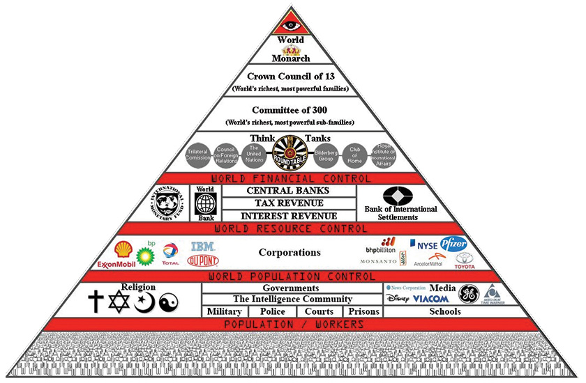 İngiliz derin devletinin dünya hakimiyetini sembolize eden bu pramitin en tepe noktası İngiltere Krallığını simgeler. 13'ler Konseyi, 300'ler Komitesi ve bunlara bağlı çeşitli düşünce kuruluşlarının himayesinde gelişen bir kontrol mekanizması öngörülmüştür. Bunlar, dünya merkez bankasını, vergi ve faiz değerlerini kontrol edecek ve bu kontrol mekanizması dünya kaynaklarının denetimi ile devam edecektir. Dünya nüfusunun kontrol altına alınması ise dinlerin, hükümetlerin, medya ve okulların kontrolü ile sağlanacaktır. Bu denetim altında, ordu, polis ve yargı da söz konusu gücün kontrolü altına girecektir. |