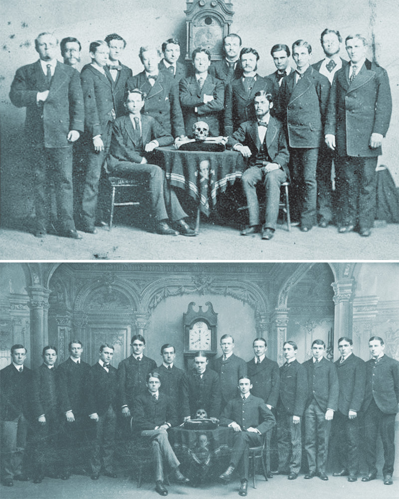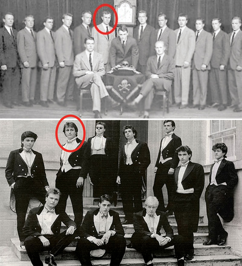 Üstteki resimde Skull and Bones Kulübü üyesi George W. Bush, alttaki resimde ise Skull and Bones'un İngiliz şubesi sayılan Bullingdon Club üyesi David Cameron ve Boris Johnson görülüyor. Bush, fotoğrafla ilgili şu açıklamayı yapmıştır: "Son sınıf öğrencisiyken gizli bir örgüt olan Skull and Bones'a katıldım. Oldukça gizliydi; daha fazlasını söyleyemem." |