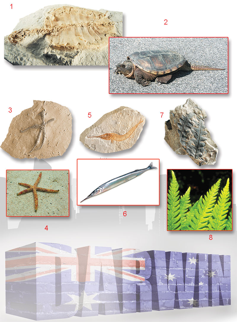 1. 140 milyon yıllık kaplumbağa fosili2.Kaplumbağanın günümüzde yaşayan örneği 3. 380-400 milyon yıllık yılan yıldızı fosili4. Yılan yıldızının günümüzde yaşayan örneği | 5. 152 milyon yıllık yarımgagalı balık (halfbeak fish) fosili6. Yarımgagalı balığın günümüzde yaşayan örneği 7. 354-290 milyon yıllık eğrelti otu fosili8. Eğrelti otunun günümüzde yaşayan örneği |
