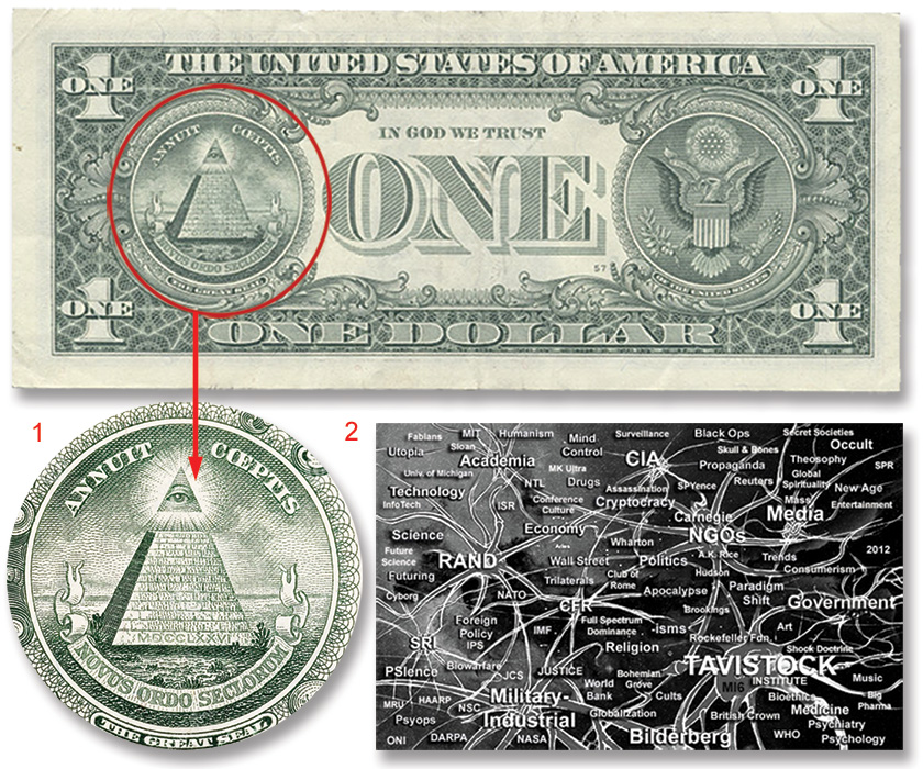 1. Doların üzerindeki 13 kademeli piramit, dünyaya hakim olan güçlerin teşkilat şemasıdır. Piramidin zirvesinde "Evrenin Ulu Mimarı"nın gözü sembolize edilmiştir. 2. Tavistock Enstitüsü'nün fiziksel, duygusal, zihinsel ve ruhsal kontrolünü simgeleyen şema |