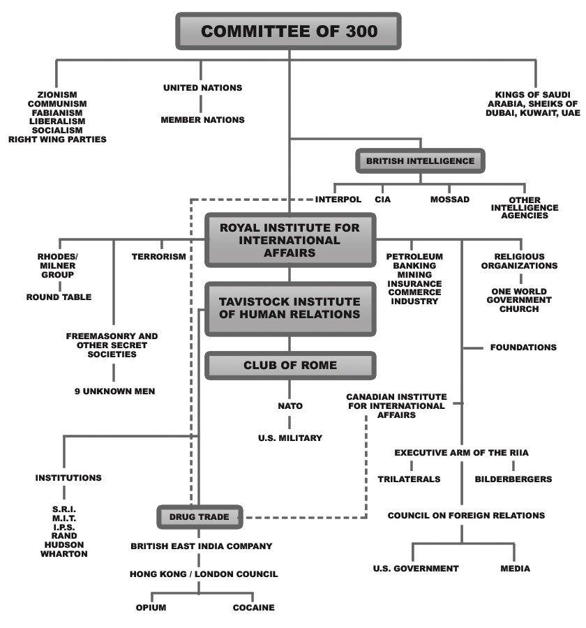 Dr. John Coleman'ın yaptığı araştırmalarla hazırladığı ve yanda resmi görülen kitabında yer verdiği bu şema, 300'ler Komitesi liderliğinde İngiliz derin devletinin desteklediği kuruluşları göstermekte ve dünyada nasıl bir örtülü yapılanma olduğunu gözler önüne sermektedir. |