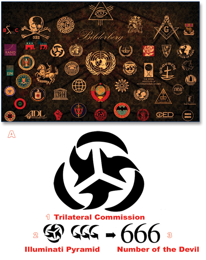 Skull and Bones, Trilateral Komisyon, CFR, Gül Haç ve bunun gibi pek çok grup birbirleriyle bağlantılıdırlar. Bu kurumlar yoluyla İngiliz derin devleti, tüm faaliyetlerini Avrupa'dan yönetmekte, ABD iç ve dış politikasına etki etmektedir. Trilateral Komisyon'un, şeytanın şifresi kabul edilen 666 sayısından türetilen amblemi |