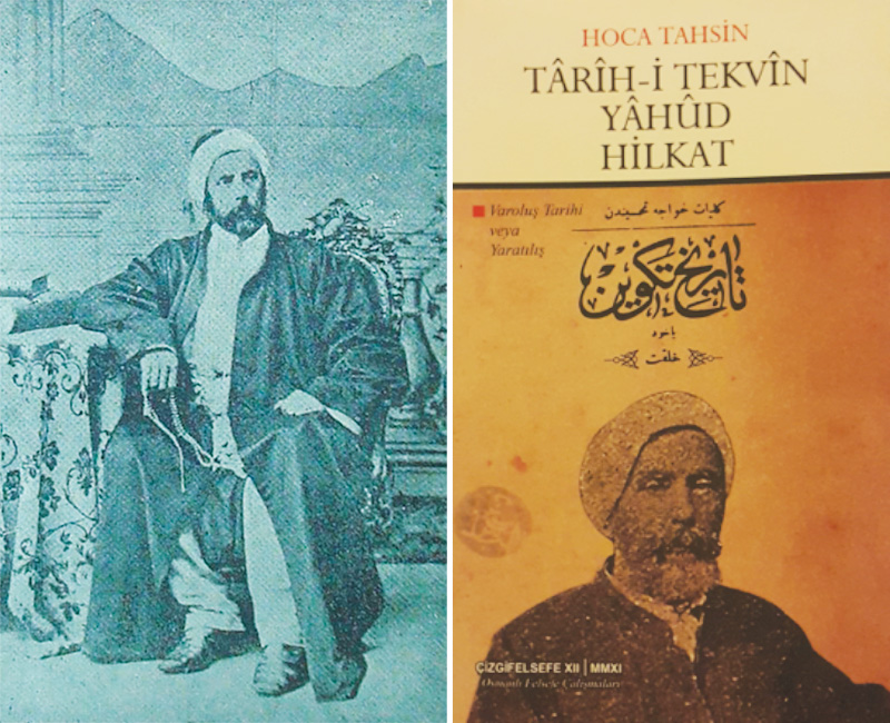 Hoca Tahsin Efendi, Varoluşun Tarihi veya Yaratılış kitabında ise kainatın oluşumunu, insan ve diğer canlıların meydana gelişini evrimle açıklamasıyla ve evrimi yaygınlaştırmasıyla ünlüydü. Materyalist felsefeyi benimsediği için "Mösyö Tahsin" olarak da anılıyordu. Hoca Tahsin Efendi, El- Ezher mezunu evrimci Cemaleddin Afgani'yi İstanbul'a getirtmiş ve İstanbul Üniversitesi'nde evrim propagandası yapmasını sağlamıştı. Afgani de, Hüseyin El-Cisr'in evrimci kitabının önemli savunucularındandı. Hoca Tahsin çok sayıda öğrenci yetiştirmiş, "yetiştirdiği gençlerin itikadını bozduğu" gerekçesiyle daha sonra görevden alınmıştır. Ancak yetiştirdiği materyalist talebeler, Osmanlı'nın dört bir yanındaki köylere kadar hoca olarak gitmiş ve eğitim vermiş, böylelikle Darwinizm Osmanlı'da hızla yayılmıştır.