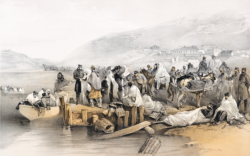 Kırım Savaşı sırasında Balıklava'daki limandan tekneye bindirilen hastaları temsil eden resim (William Simpson, 24 Nisan 1855) |