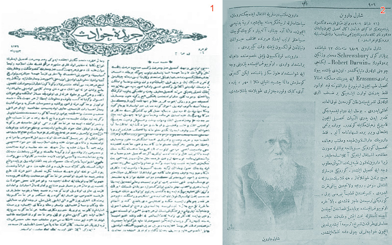 1. Abdülhamid döneminde İngiliz William Churchill tarafından çıkarılan Ceride-i Havadis (yanda), İngiliz çıkarlarını Osmanlı kamuoyuna örtülü bir şekilde benimsetmeye çalışmıştır. 2. Selanik'te yayınlanan Bahçe Dergisi'nde Darwin'in hayatını anlatan yazı. (1909) |