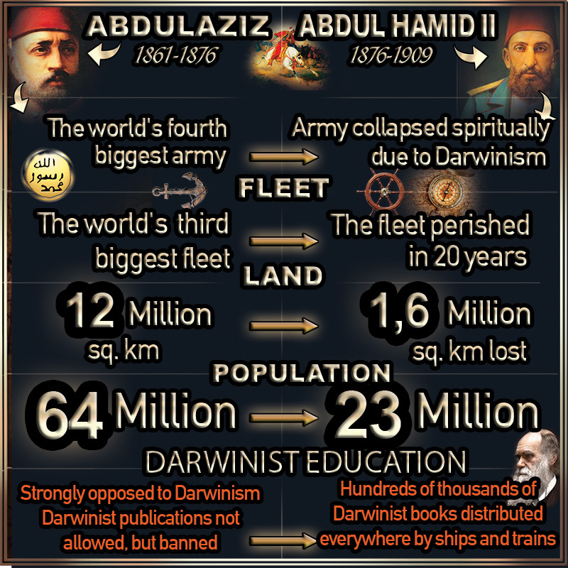 İngiliz derin devleti, Darwinizm belasını Osmanlı'da yaygınlaştırabilmek için özel bir zaman seçmiştir. Bu, İmparatorluğun büyük ölçüde kan kaybettiği, gücünü, nüfuzunu ve etkisini yitirdiği 19. yüzyıl sonlarıdır. "Aydınlanma" kılıfı altında, yine Osmanlı bünyesindeki materyalizmi modernlik sanan bazı kişiler kullanılarak bu veba Osmanlı coğrafyasına girmiş ve oldukça sinsi bir şekilde yaygınlaştırılmıştır. İngiliz derin devleti denetiminde kurulan dernekler, kurumlar ve okullar hep Darwinizm telkini üzerine faaliyet göstermiş ve başta Hilafetin temsil edildiği güzide Türk milleti ve neredeyse tüm İslam toplumları, bir anda "Allah yok" diyen bir akımın pençesine düşürülmüştür (Allah'ı tenzih ederiz).