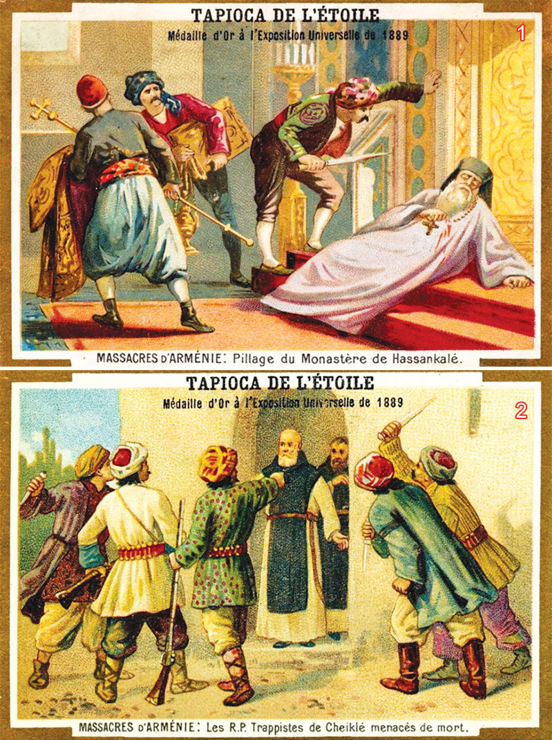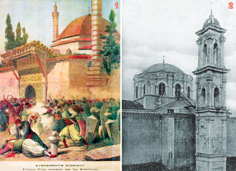 (1) Bir Fransız dergisinde yer alan, Osmanlı'daki Ermeni isyanlarının temsili resmi(2) İzmir'de bulunan, Osmanlı döneminde inşa edilmiş bir Ermeni Kilisesi (1915) |