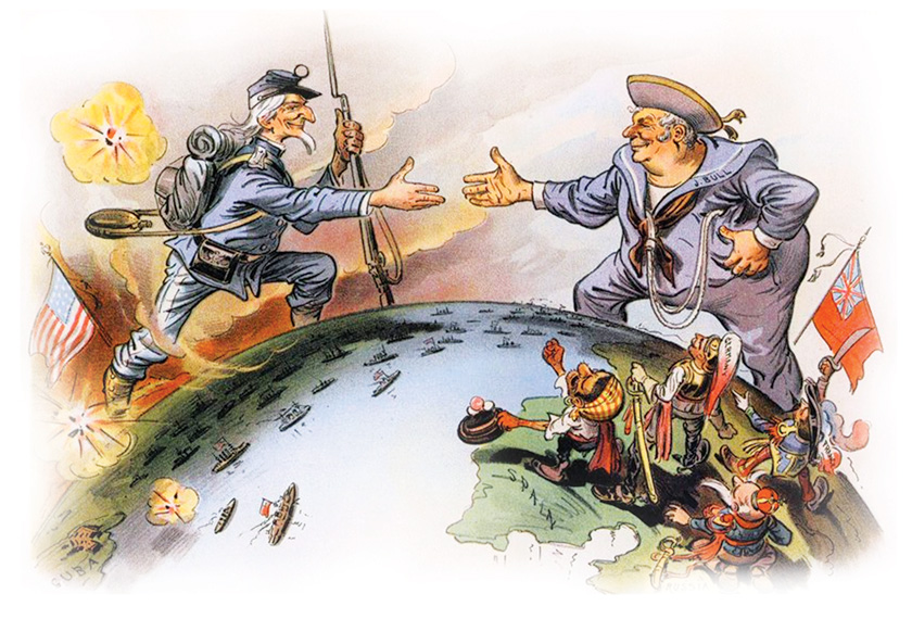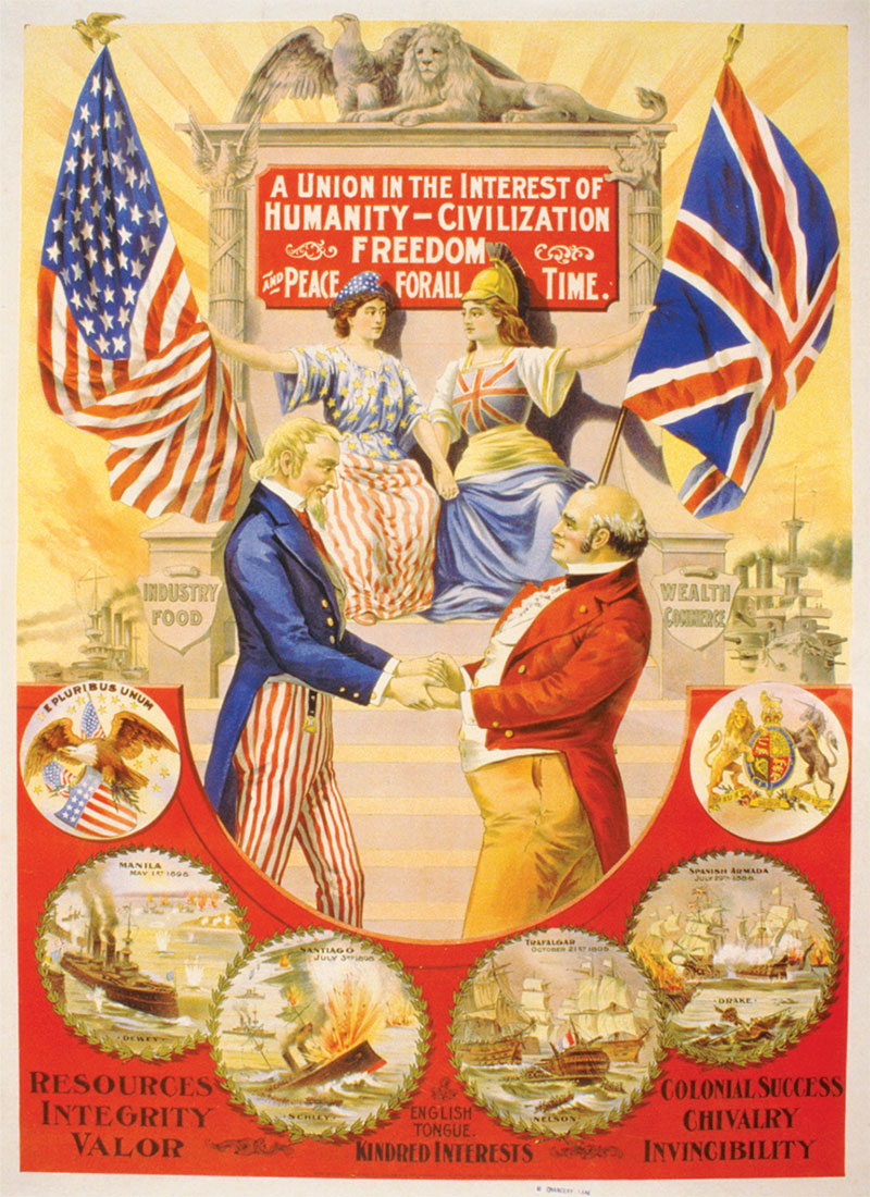 İngiliz derin devletinin ABD üzerindeki etkisi, Büyük Yakınlaşma (Great Rapprochement) olarak adlandırılıyordu. İngiltere'yi sembolize eden John Bull ve ABD'yi temsil eden Sam Amca tiplemelerinin el ele verdiği propaganda posterleri her yerdeydi. |