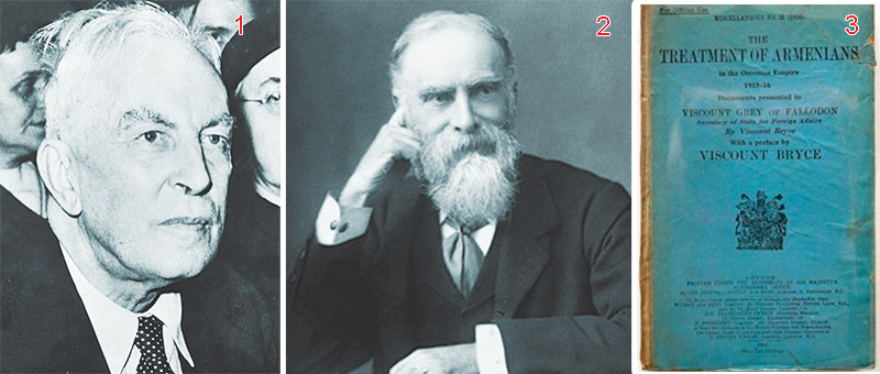 The propaganda book The Treatment of Armenians in the Ottoman Empire authored by Arnold J. Toynbee (top) together with James Bryce (bottom), the British historian and statesman. Toynbee later felt remorse for the false allegations he included in the book. |
