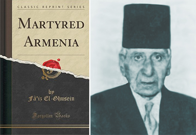 Faiz El-Ghusei tarafından yazıldığı iddia edilen Martyred Armenia (Şehit Ermenistan) isimli propaganda kitabı. Tarihçiler, Osmanlı'da çeşitli bürokratik görevlere gelmiş bu isimde hiç kimseye rastlamamışlardır. |