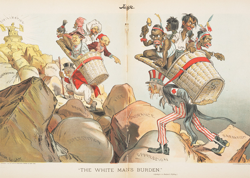 Rudyard Kipling tarafından yazılmış ve 10 Şubat 1899'da The New York Sun'da yayınlanmış olan "The White Man's Burden" (Beyaz Adamın Yükü) isimli şiir, İngiltere'yi temsil eden John Bull ile Amerika'yı temsil eden Sam Amca'nın beyaz olmayan ırklar üzerinde hakimiyetini ima ediyordu. |
