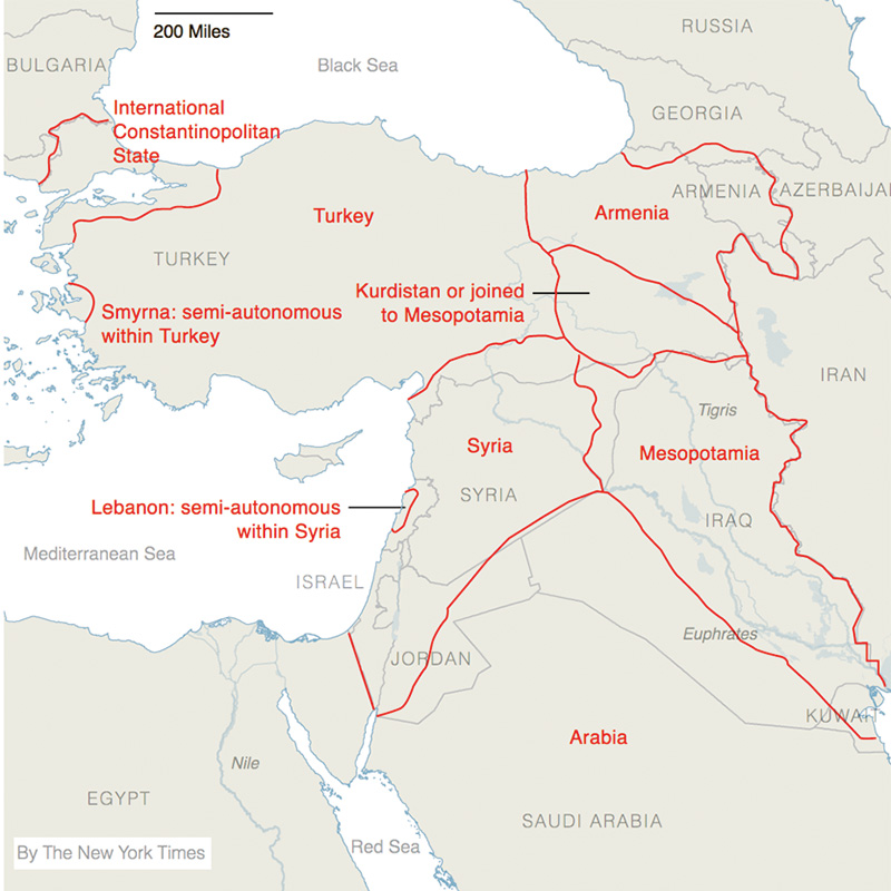 14 Mayıs 2016 tarihli New York Times Gazetesi, I. Dünya Savaşı sırasında gizli olarak imzalanan ve Osmanlı topraklarını parçalara ayıran Sykes-Picot Antlaşması'nın 100. yıl dönümünde, dönemin ABD Başkanı Woodrow Wilson tarafından hazırlanan bu haritayı yayınladı. Amaç, Sykes-Picot'nun hala geçerli olduğunu hissettirmek, İngiliz derin devletinin parçalama planının hala gündemde olduğu imajını vermekti. |