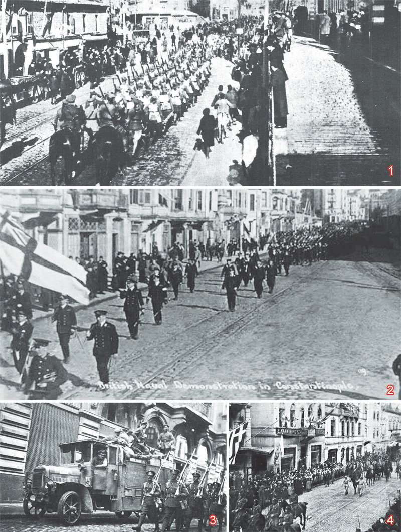 (1) Harbiye-Şişli yolu üzerinde işgal kuvvetlerinin yürüyüşü(2 and 3) Bİngiliz askerleri Beyoğlu'nda geçit töreninde(4) İstiklal Caddesi'nde işgal kuvvetleri |