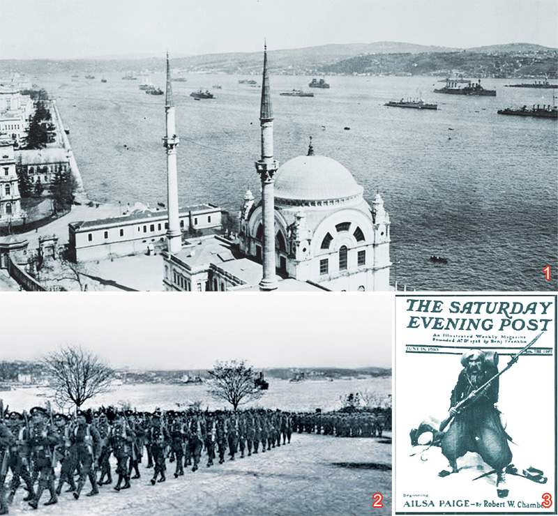 (1) İşgal yılarında Dolmabahçe önündeki itilaf devletlerine ait gemiler(2) Allied troops landing at Sarayburnu(3)1910 yılında Amerika'da yayınlanan The Saturday Evening Post'un kapağında, barbar ve vahşi bir biçimde çizilmiş Türk askeri resmi. O dönemde ABD basını, Ortadoğu ile ilgili bütün istihbaratı İngilizlerden almakta ve bunun sonucunda korkunç bir "Türk" algısı oluşmaktaydı. (Türk Milletini tenzih ederiz.) |