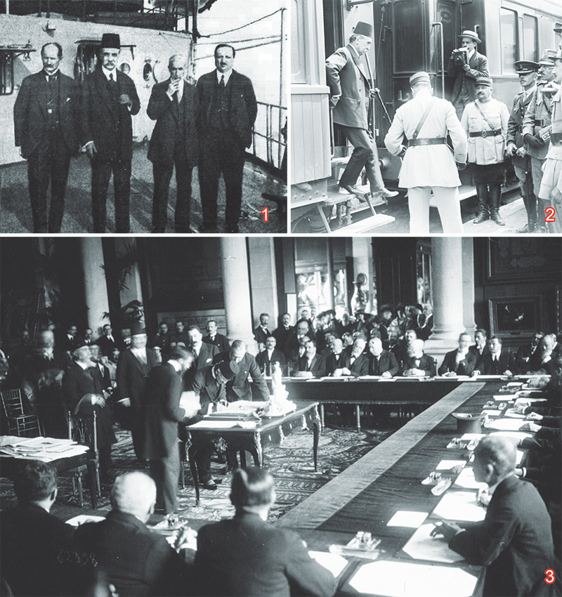 (1) Sevr Antlaşmasını imzalayan Osmanlı heyeti. Soldan sağa; Rıza Tevfik, Damat Ferid Paşa, Hadi Paşa, Reşid Halis.(2) Damat Ferid Paşa, Sevr'de trenden inerken(3) Türk topraklarının itilaf Devletleri'ne teslim edildiği Sevr Antlaşması'na imzalar atılırken |