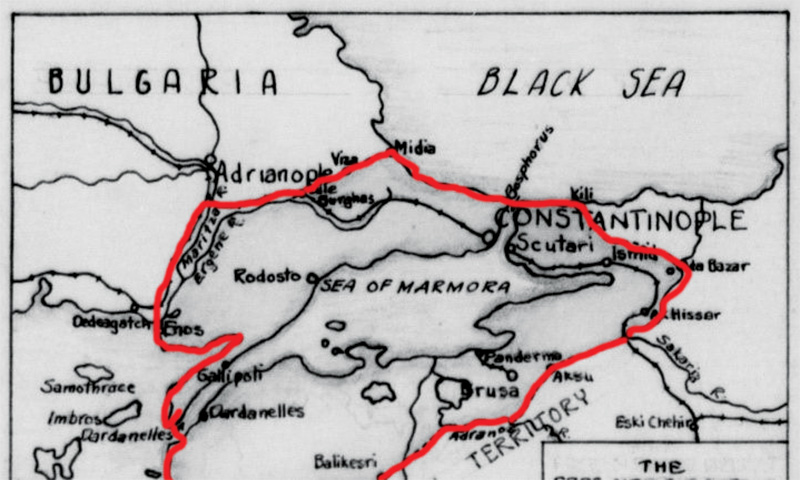 Amerikan Ulusal Arşivi'ndeki 867.00/883 numaralı belgeye göre, gizlice planlanan İstanbul Devleti Projesi'nin haritası |