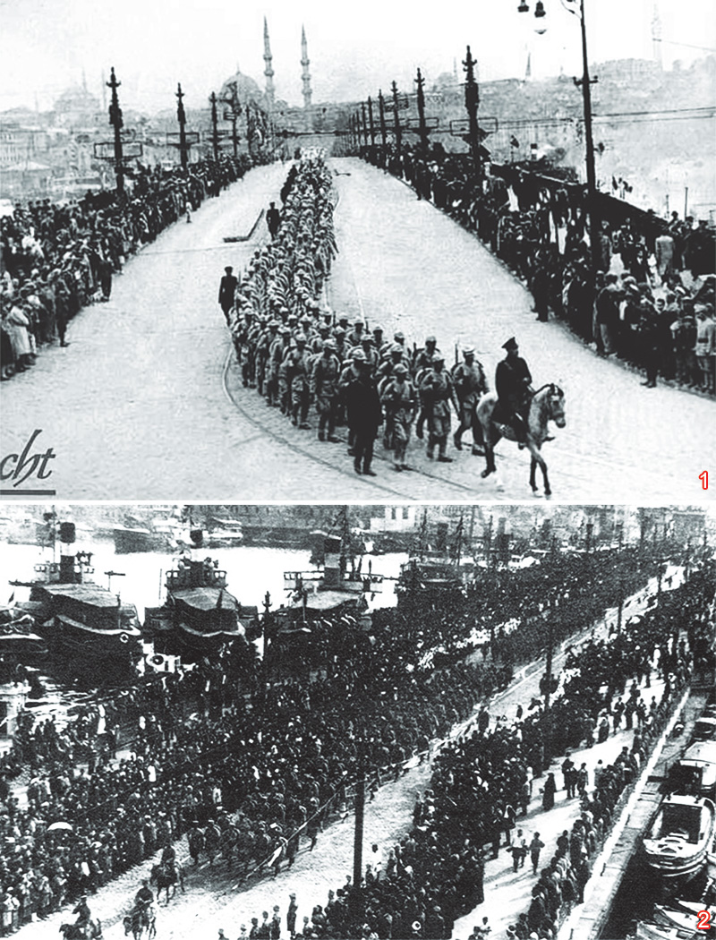 (1) İstanbul'un kurtuluşu sonrasında Galata Köprüsü üzerinde Türk Ordusu'nun resmi geçidi (2) 6 Ekim 1923, Şükrü Naili Paşa'nın komutasındaki kahraman Türk ordusu, Gatala Köprüsü'nden geçerken, İstanbulluları selamlıyor. |