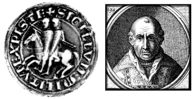 En solda Tapınakçılar’ın ünlü sembolü: Aynı ata binmiş iki Tapınakçı. Umberto Eco, örgütün böyle ilginç bir sembol seçmiş olmasının, homoseksüelliklerinin bir işaret olduğunu söylüyor.Yanda ise Tapınakçıları yasadışı ilan eden Papa V. Clement. |